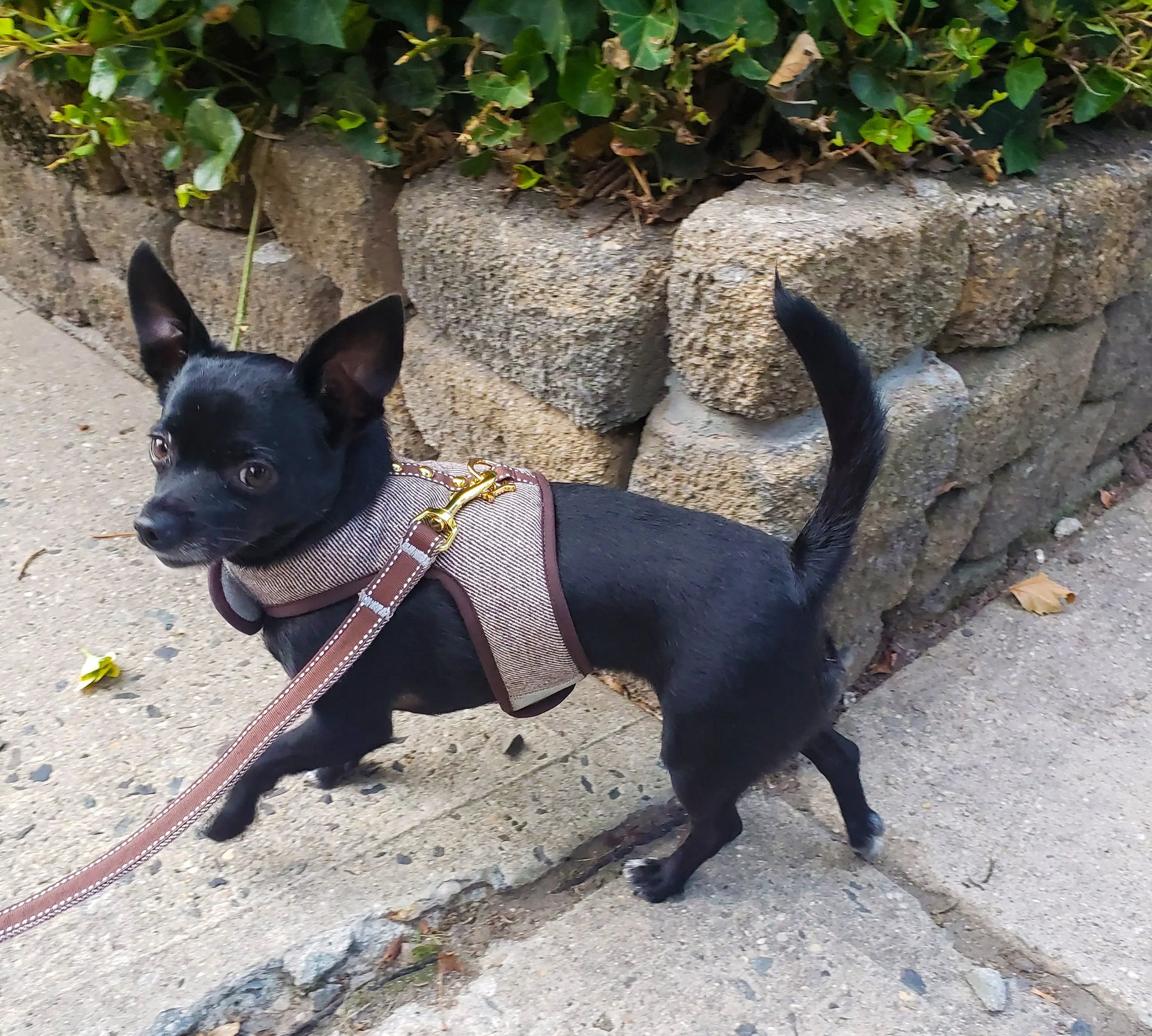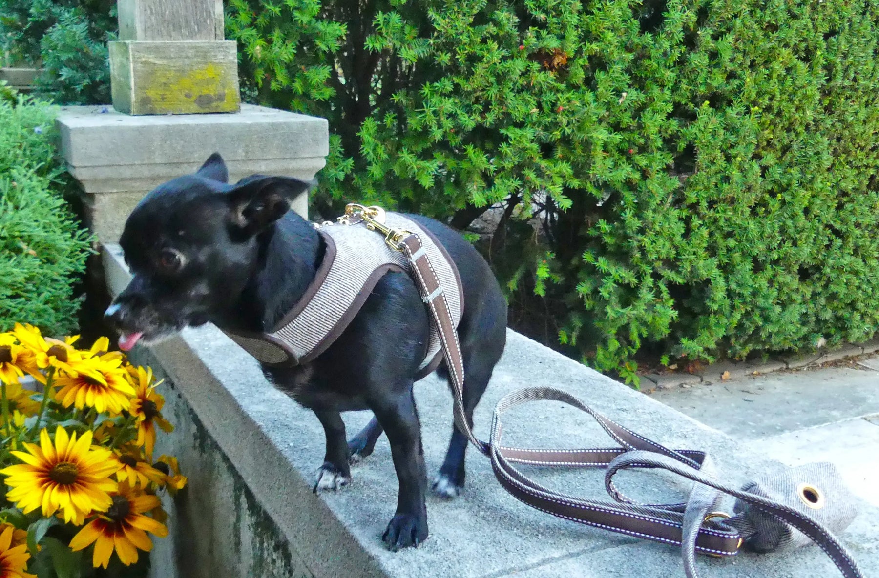 Dress for success on your walk together. Town & Country. A luxury TWILL flannel dog harness, to look great in cool and cold weather. Designed specifically for the safety and comfort of little dogs and puppies. No Buckles! This is the same styling and fit as the beloved Athletic Mesh Dog Harness, one of the most popular harnesses available for teacup and tiny dogs.
