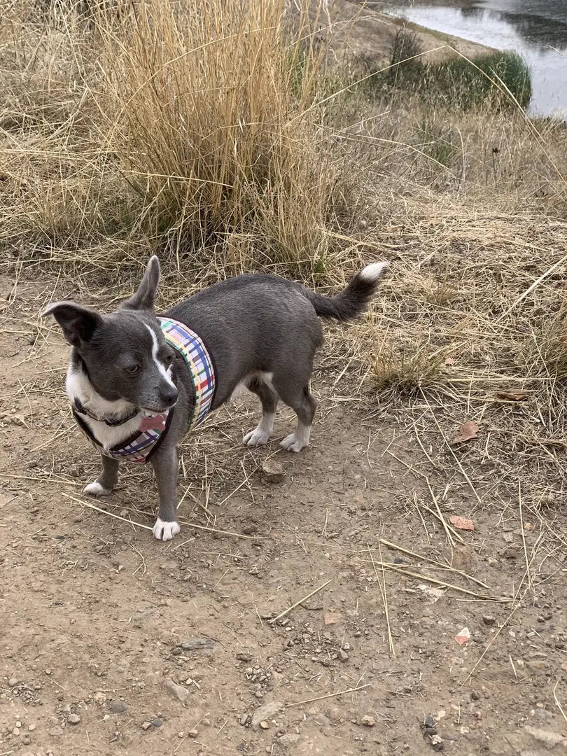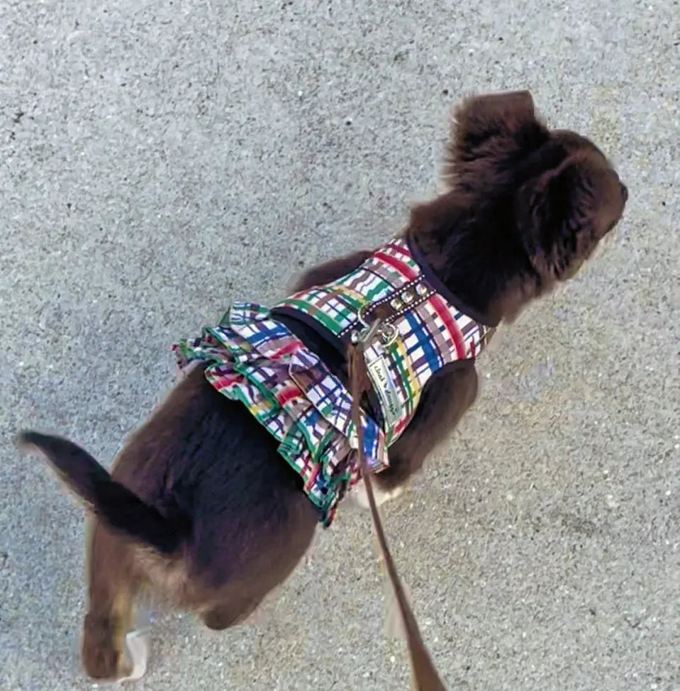 An adorable lightweight yet durable vest dog harness for extra small dogs up to 7/8 LBS. The exclusive forest friends plaid print is available with a coordinating leash, and matching skirt.Â
