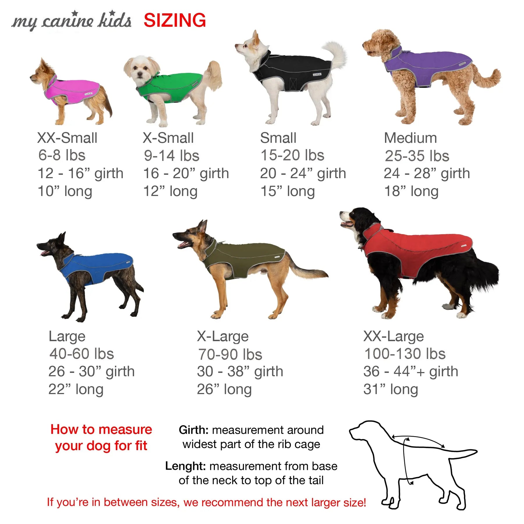 This coat is generously sized - so please read the chart and we would suggest that you choose the size that most closely matches your dogs stats!  its not perfect . . . but between considering the weights, adjustments and back lengths the sizes are fairly accurate.