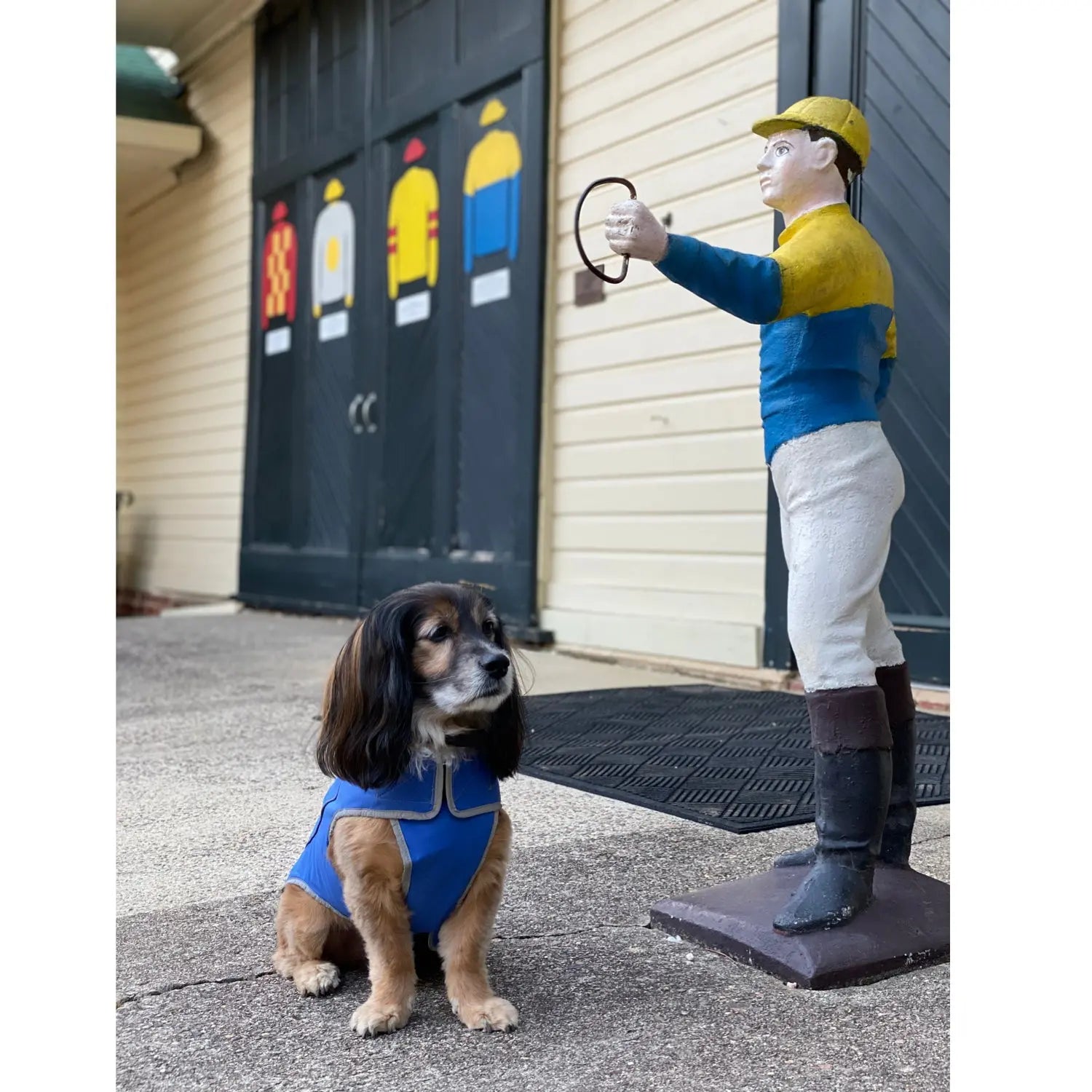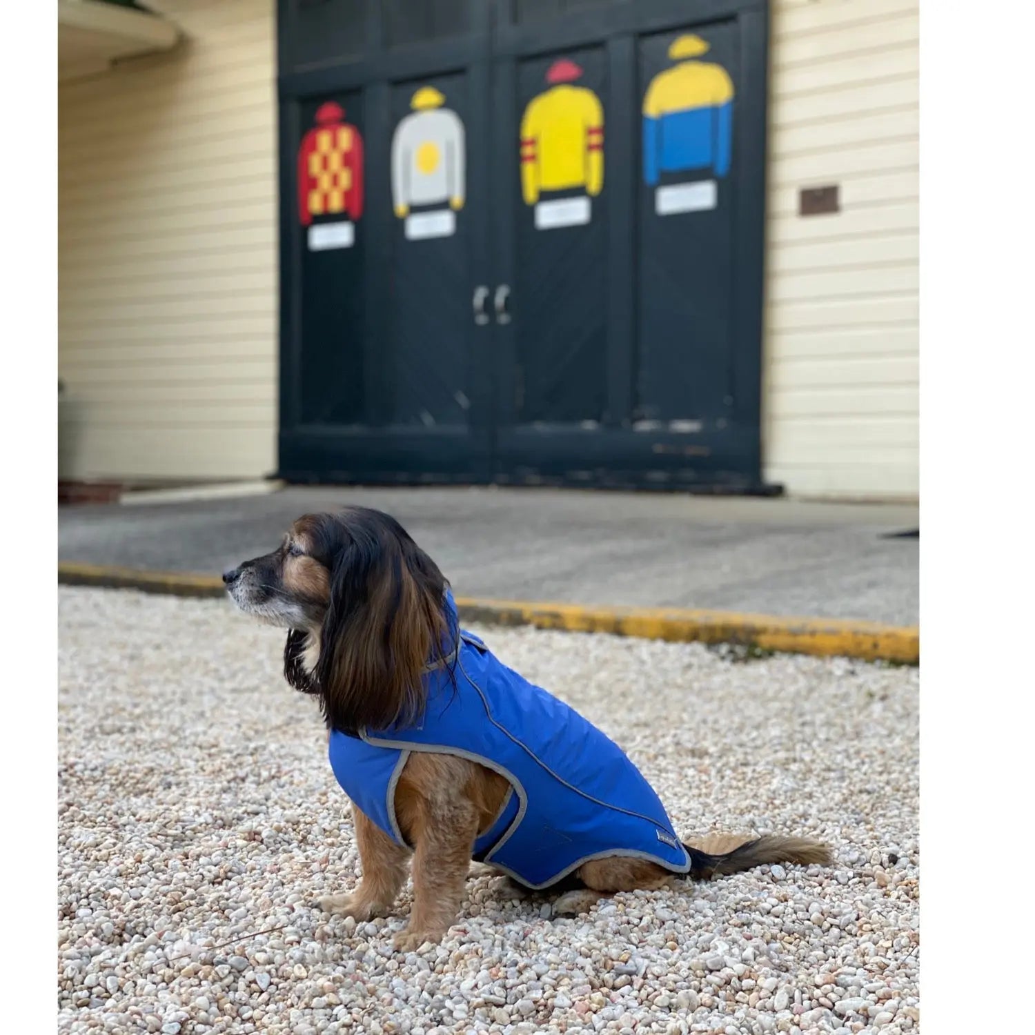 Precision Fit Dog Parka Royal - L Dog sitting on a driveway