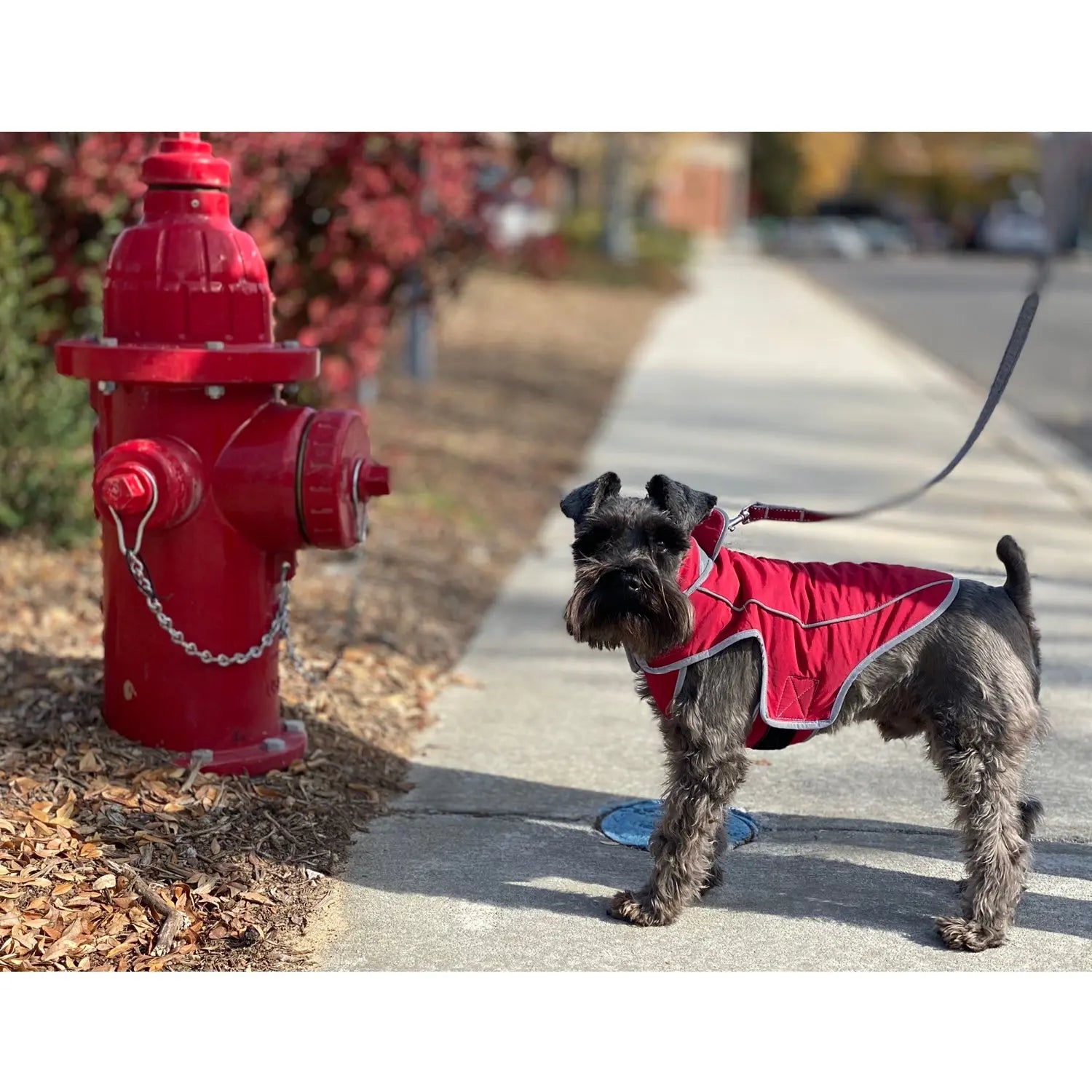 Precision Fit Dog Parka Red Dog standing by a hydrant