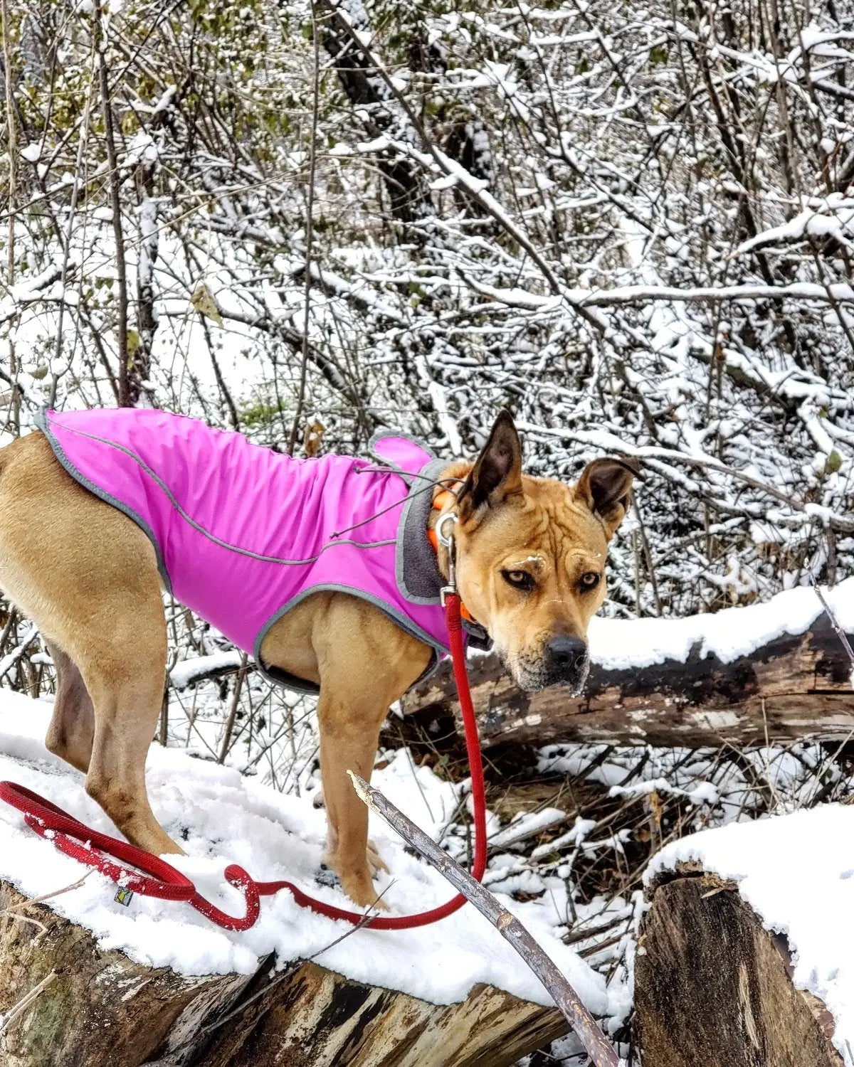 Precision Fit Dog Parka Pink - XXL Dog walking in the snow